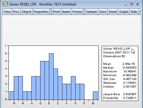 5. Munculah kotak dialog Series: RESID_LDR, klick View + Descriptive Statistics & Test lalu pilih Histogram and Stats.